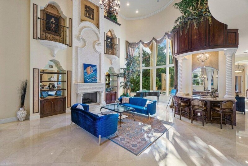 Truly unique, this spectacular estate is a masterpiece of design and unparalleled craftsmanship. This stunning home boasts a generous, expansive footprint, offering an abundance of space both inside and out, perfect for those seeking room to grow and entertain in comfort and style. A grand entryway leads to a breathtaking two-story living room adorned with intricate ceiling details, a cast-stone fireplace, oversized windows, and a wet bar with custom cabinetry. Opposite the living room, the formal dining area features flanked built-in custom buffets with rojo alicante marble. Adjacent is the gourmet kitchen, a chef's dream, complete with a lit translucent marble island, high-end appliances, bar seating, and eat-in dining space. The family room offers a relaxed setting with a built-i.
