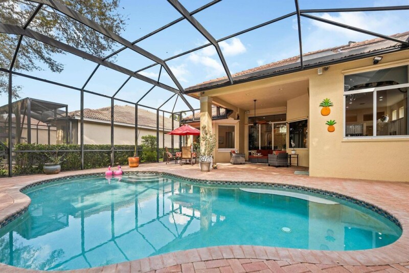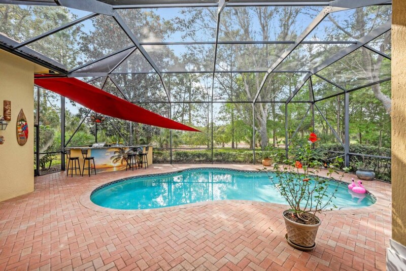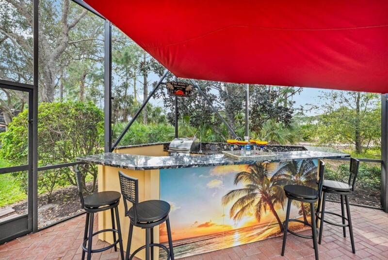 Welcome to 8821 Champions Way, a meticulously maintained home located in the prestigious PGA Village.This spacious residence offers over 2300 sq feet of living space, 3 bedrooms, 3.5 bathrooms, including a convenient cabana bathroom. The open-concept layout creates a seamless flow between the living, dining, and kitchen areas, perfect for both relaxation and entertaining. The kitchen is a chef's dream with granite countertops, 42 cabinets, & stainless-steel appliances. The spacious primary suite features an en-suite bathroom with dual sinks, a separate shower, and a soaking tub, providing a private retreat. Step outside to the solar heated, screened in pool, with a newly installed custom outdoor kitchen complete with a sink, ice well, grill & granite countertops.