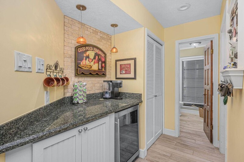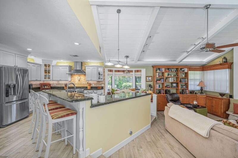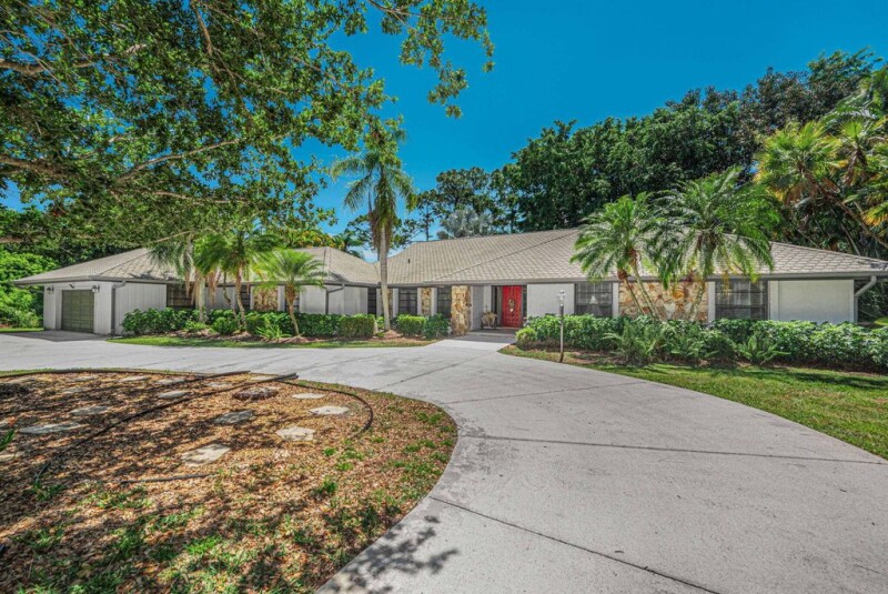 As you enter the winding driveway of your private, 1.55 acre paradise, you are greeted by a lush, tropical canopy of trees, that protect the home from view from the street. Upon entering the home, you are welcomed by abundant natural light from 3 French style sliders that showcase the courtyard style screened pool. This stately home features many high-end and well thought out architectural details such as vaulted wood ceilings, a showcase fireplace, built-in shelving, wood-look ceramic tile, and well-appointed bathrooms and kitchen. Encircled by mature landscaping, you can leave the blinds up and view the lush greenery from every room. Private in-law suite with its own wing. New water heaters. Price per foot, this is one of the best deals in Martin Downs!.