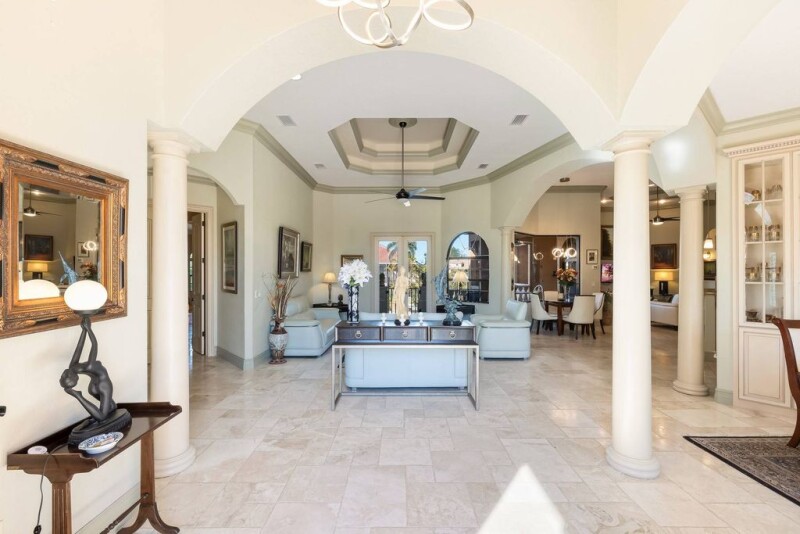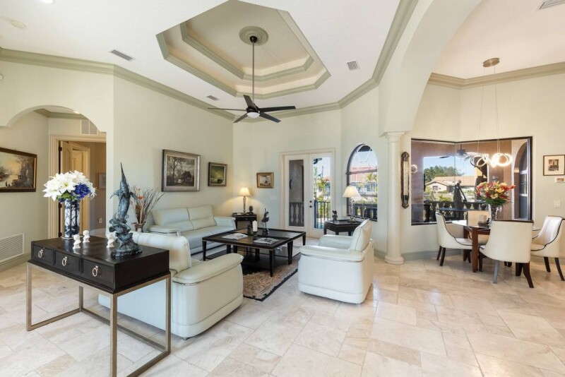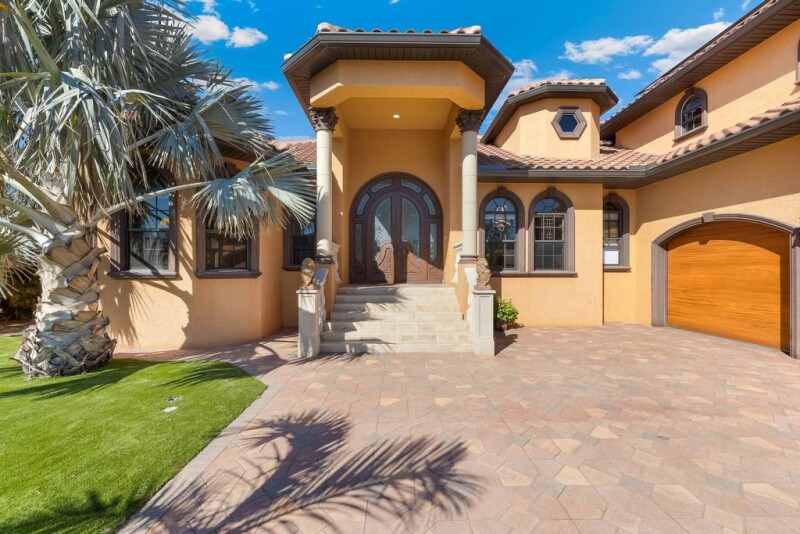 One or more photo(s) has been virtually staged. Discover the epitome of waterfront luxury at 150 Mandalay Road in Punta Gorda, where elegance and comfort come together in a stunning custom-built 2007 home. This grand two-story residence features 5 bedrooms, 4.5 baths, and endless possibilities for gracious living. From the moment you arrive, the impressive double glass front doors with exquisite etching welcome you into a world of sophistication. Inside, soaring ceilings ranging from 10 to 14 feet, crown moldings, tray ceilings, and arched doorways create an ambiance of timeless elegance, complemented by stunning flooring throughout the home. The master suite is a true haven, located on the main living floor for added convenience. Spacious and serene, it features large walk-in closets and provides a luxurious retreat within the home. The gourmet kitchen offers granite countertops and ample space for culinary creativity, while the versatile 14x11 den provides the flexibility to serve as a sixth bedroom. The expansive 30x13 upstairs bedroom room, complete with its own balcony and half bath, is ideal for entertaining, relaxing, or creating a private retreat. This home is perfect for both intimate living and large-scale entertaining, with spaces designed to flow seamlessly from indoors to outdoors. The private, fenced pool area is surrounded by a lush palm wall, offering unmatched privacy for the 13x40 travertine-tiled pool. The spacious rear porch invites you to envision an outdoor kitchen, making this home an entertainer's dream. A new roof provides peace of mind, while solar panels on the roof provide cost savings and a thoughtful touch of environmental consciousness. Situated on a sailboat canal with just 20-minute access to Charlotte Harbor and the Gulf, this home is a boater’s paradise. The property features a private dock and personal boat ramp, offering unmatched convenience for water enthusiasts. Aquarium-style windows frame captivating views and enhance the seamless integration of indoor and outdoor spaces. Every detail of this home, from the etched glass front doors to its impeccable finishes, has been designed to create an unparalleled living experience. Schedule your private showing today to explore this magnificent home and the extraordinary lifestyle it offers.