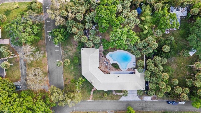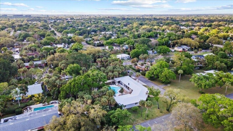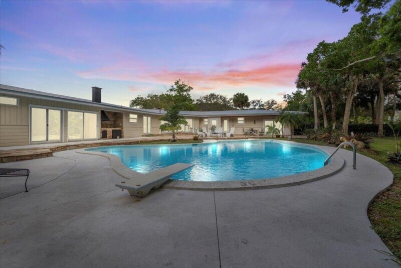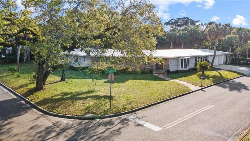 This stunning 5-bedroom, 4.5-bath pool home sits on 3/4 acre, beautifully landscaped corner lot, just 10 minutes from the beach and waterfront dining. Fully renovated, it blends modern updates with classic Florida charm. Inside, you'll find oak wood floors, terrazzo, and Brazilian red cherry block flooring, with cypress tongue-and-groove ceilings, crown molding, and recessed lighting. The updated kitchen features granite counters and stainless steel appliances. Enjoy a massive lagoon-style pool with a diving board, spa, and beach area, plus a summer kitchen and cabana bath. Highlights include impact glass windows, a metal roof, two new AC systems, a 3-car garage, two laundry rooms, a wood-burning fireplace, two new water heaters and a flagstone-paved patio. Don't miss this retreat!.