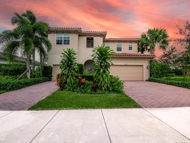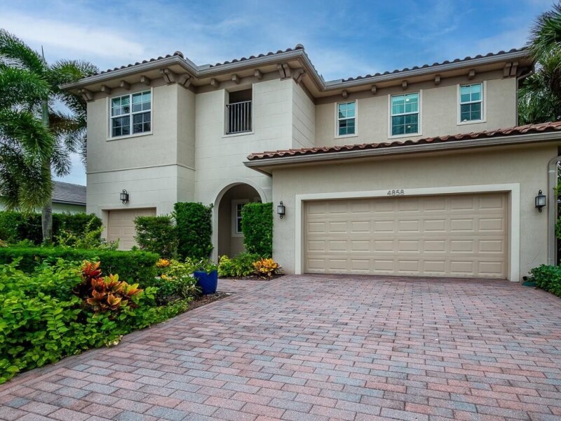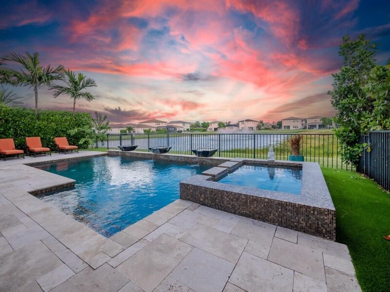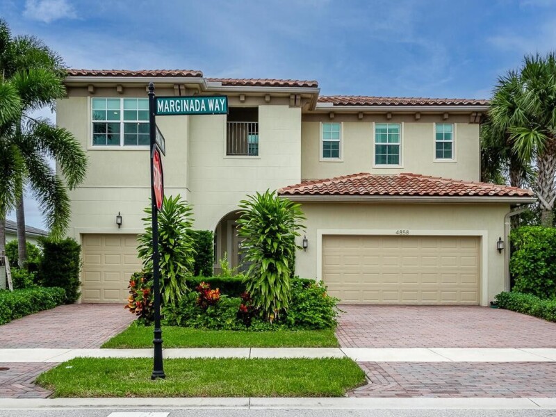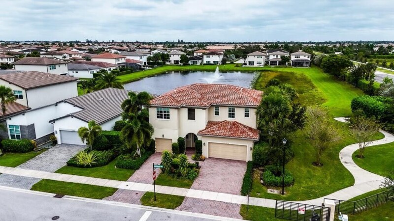 Exquisite builder model home available! This stunning, like new home, (built in 2017 in Andalucia) boasts 5 bedroom-PLUS a huge upstairs loft, 4.5 bathroom property has premium upgrades and luxurious features. A gated entry leads to a corner premium lot with a serene lake view, pool, fountains and oversize side yard . Notice the split driveway -3 car garage and double paved driveway. Inside, enjoy 10' ceilings, wood flooring, and smart home capabilities. Control multiple features by the touch of your phone! The kitchen is equipped with high-end stainless steel appliances, gas stove, a double oven, an immense walk-in pantry, and an inviting island. The laundry area is off to the kitchen and includes front loader washer/dryer, granite countertops, sink & cabinets.