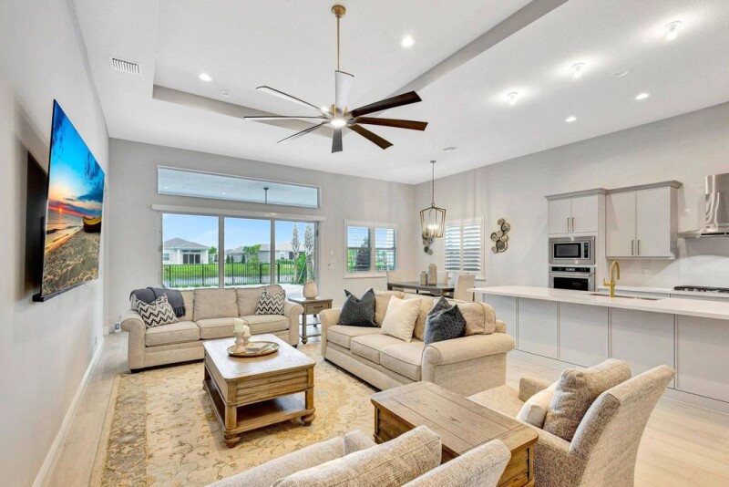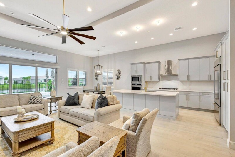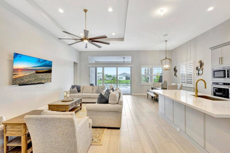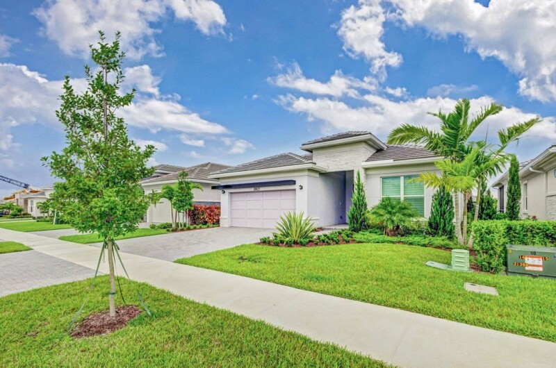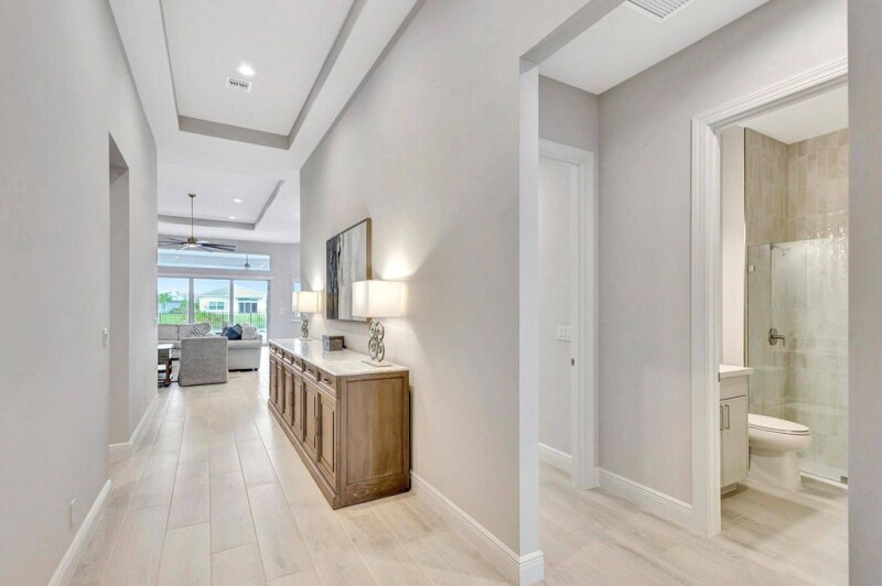 Discover this exquisite 3-bedroom, 3-bathroom home with office, located in the sought-after Regency neighborhood of Avenir in Palm Beach Gardens. Beautifully designed living space, this residence features impact glass throughout, soaring volume ceilings, and warm flooring, complete with many upgrades you would desire. The expanded Great Room, adorned with floor to floor to ceiling windows, invites abundant natural light and offers serene water views, creating an intimate setting for both relaxation and entertaining. The kitchen is a chef's delight, showcasing upgraded cabinets, an oversized island, and a spacious dining area with peaceful outdoor vistas. Retreat to the luxurious primary suite, where you'll find tranquil views of the outdoor lush landscaping and lake views. The spa-like.