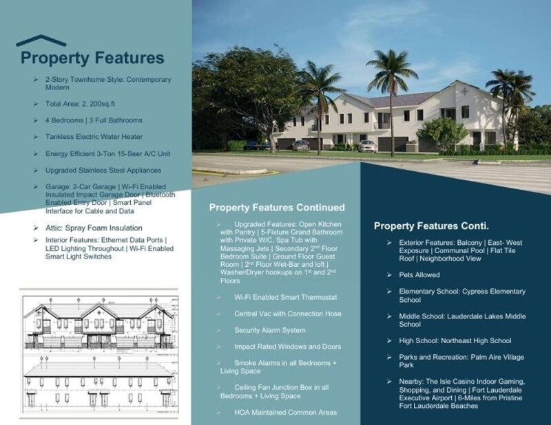 New Townhomes just broke ground! This contemporary 2-story townhouse is located in Palm Aire and has 4 bedrooms and 3 full bathrooms. This modern home comes with a loft, porch, balcony, 2-car garage, and community pool. The split bedroom floor plan features high 9'-0'' to 9'-4'' ceilings and porcelain tile floors throughout. Equipped with state of the stainless steel appliances, ring pro door bell, washer/dryer hookup, and much much more. This is a must see! Owner will accept 5% to go into contract!.