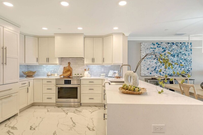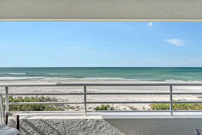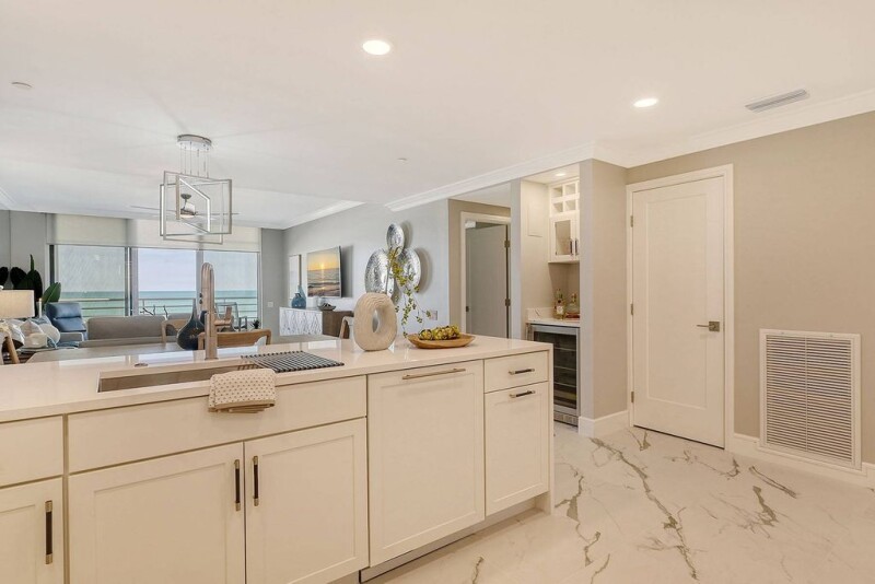 Welcome to your dream oasis. Just completed fully updated, turnkey furnished unit, directly on the Gulf, at Sunset Beach. This stunning retreat boasts spectacular renovations, featuring a custom kitchen with solid wood cabinets, a light commercial-grade hood fan and elegant quartz countertops throughout. The kitchen has a GE Monogram induction stove with a convection oven, a GE Monogram refrigerator and dishwasher, and a Sharp microwave drawer. You can experience the conveniently located laundry room with a Speed Queen washer and dryer. Endless Tankless Tempra hot water system, bar fridge, and a new air conditioning unit. Both baths are equipped with Hansgrohe water fixtures and Kohler electric toilets. A complete trim package, including crown molding and solid core doors, enhances the finishings. Enjoy the seamless beauty of porcelain tile flooring throughout, complemented by a newer impact front door, high-impact windows, and patio slider. Additional features include remote-controlled window shades and fans. Exterior enhancements grace the common hallways with new ceramic tile. Sunset Beach, a small gated community on southern Longboat Key, features three mid-sized buildings south of Publix and CVS. You'll find yourself close to a public library, tennis courts, banks, places of worship, restaurants, and Town Hall. Embrace the lifestyle just minutes from world-renowned St. Armand's Circle and Sarasota, where endless adventures await.