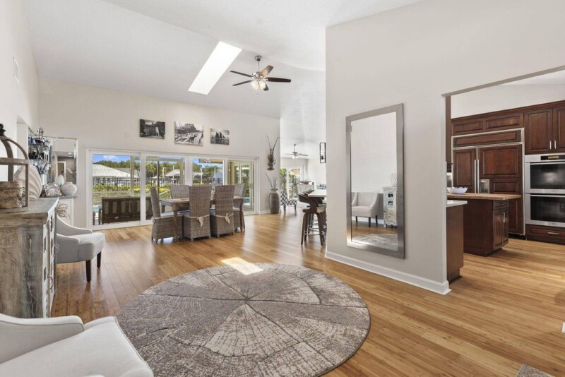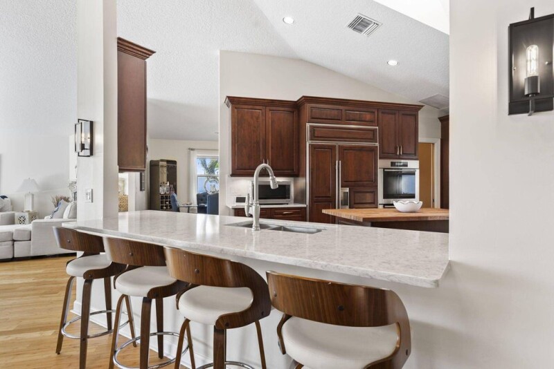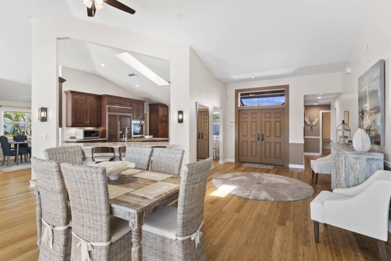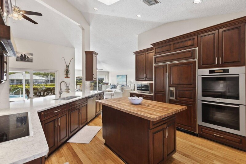 This stunning single-story waterfront home offers 190 feet of canal frontage, with a new private dock featuring Trex decking and a new 24K lb boat lift. Direct ocean access to both St. Lucie and Jupiter inlets. Enjoy a resort-style pool and spa, vaulted ceilings, and custom bamboo flooring throughout. The open-concept kitchen is newly remodeled with upgraded countertops and bathrooms. Impact windows and doors provide added security. A steel roof with stone coating mimics barrel tile and offers extra storm protection. The garage floor is freshly epoxied. Situated on a cul-de-sac, this home is in a non-flood zone on a 120-ft wide canal, offering luxurious living with privacy and style.