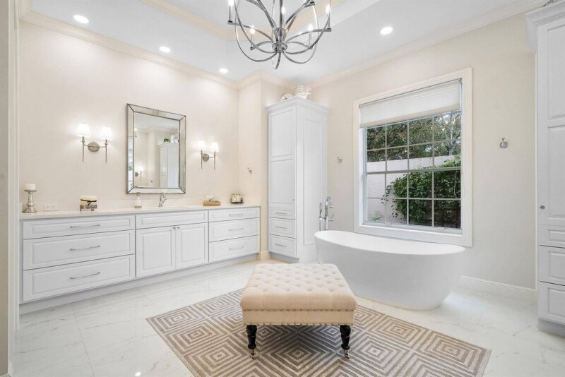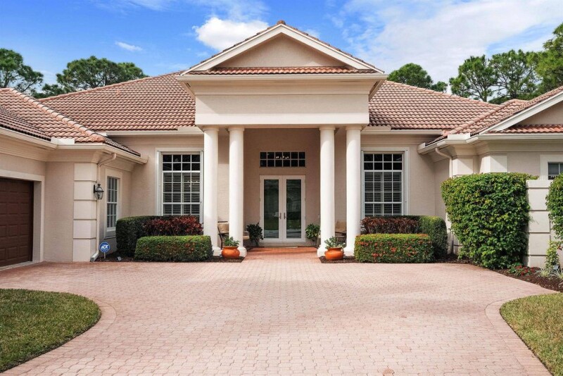 Discover luxury living in this beautifully updated pool home in Pinehurst at PGA Village. Offering stunning views of the Ryder Golf Course's 5th green & 6th tee box. Built w/CBS construction, it features a durable tile roof, a paver driveway & beautiful landscaping. Inside are 4 BRs, 4 full baths, den/office & 2.5-car gar. The open layout boasts soaring ceilings, plantation shutters, tile & engineered wood floors. The gourmet kitchen includes custom cabinetry, granite counters, a large isl, pot filler, gas range, marble backsplash, coffee bar & a spacious pantry. Adjacent, the family rm & breakfast area are perfect for entertaining. The main suite has walk-in closets & remodeled bath is a true showstopper w/ a lrg walk-in shower, soaking tub, dual sinks & luxurious designer finishes. Pool.
