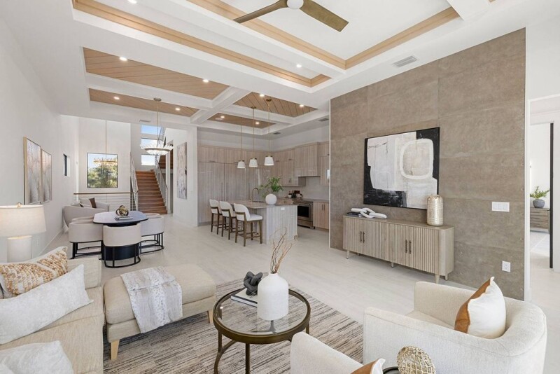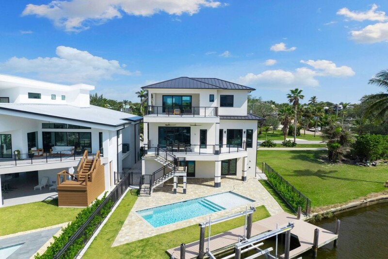 Direct waterfront, modern, luxury, coastal masterpiece with sunset views. Welcome to this brand-new 2024 beach and boater's paradise, a stunning three-level waterfront marvel with western exposure, breathtaking sunset views and a 13,000-pound boat lift with a private dock. This home is designed for ultimate luxury, featuring a private pool with sun shelf, four bedrooms plus office/gym, four baths and a motor court accommodating six-plus cars. The main-level primary suite is your private sanctuary with a spacious walk-in closet, a spa-inspired bath with dual vanities, glass-enclosed shower and private access to your outdoor balcony. The chef's kitchen showcases high-end Wolf and Sub-Zero appliances, custom handcrafted cabinetry and a seamless flow for culinary creativity. Every inch of this home exudes sophistication, from the bespoke finishes and highly detailed coffered ceilings to the Marretti Italian staircase, California closets and designer stone-tiled baths. The top-level entertainment space is ideal for hosting, complete with a living room, wine cooler, wet bar and an open-air lanai overlooking serene blue waters. Constructed with an unwavering commitment to quality, this home boasts concrete block construction, a concrete piling foundation, impact windows and doors and a standing seam metal roof. Every detail has been meticulously curated to deliver the pinnacle of modern luxury living. Perfectly located, this home offers bikeable access to pristine beaches and proximity to premier shopping and dining destinations such as Mercato, The Promenade, Coconut Point, Waterside Shops and Naples' iconic 5th Avenue. With Southwest Florida International Airport just a 30-minute drive, convenience meets exclusively in this coastal masterpiece.