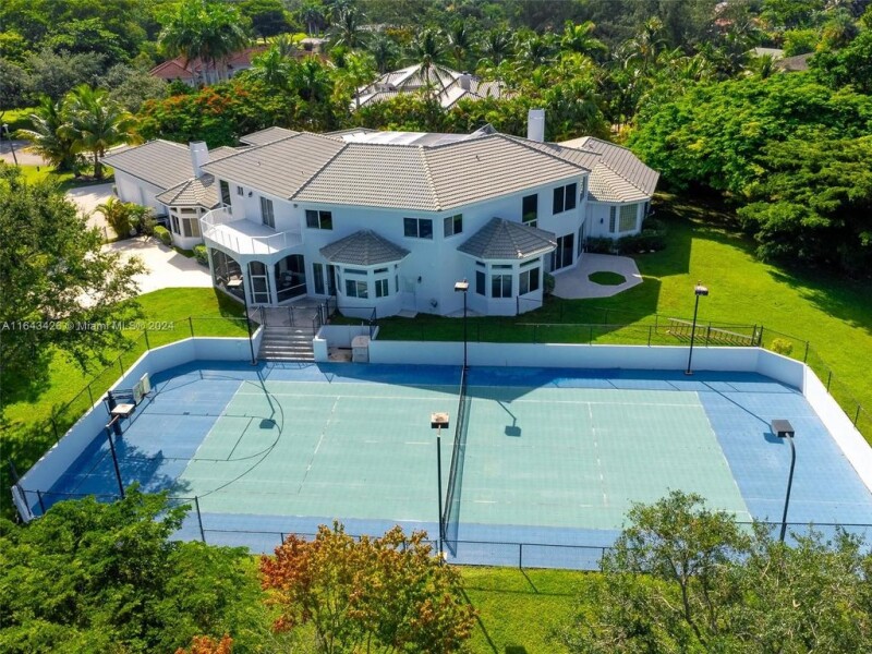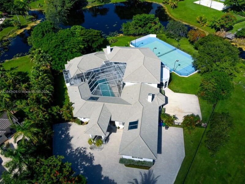 Nestled in a private cul-de-sac on the highest elevation, this custom-built home sits on 1.8 acres and offers breathtaking lake views. 9 bedrooms, 10.5 bathrooms, vaulted ceilings throughout. Ffirst floor boasts two master suites, library, office, TV room, and a chef’s kitchen, complete with two sinks, two dishwashers, a wet bar, breakfast nook, and two spacious pantries. Every bedroom has its own en-suite bath and walk-in closet. Upstairs, you'll find two bedrooms, and a large loft. Step outside to a pool, basketball court, and tennis court ( can easily be converted to a pickleball court). A 4-car garage plus additional front and side parking provide ample space for vehicles and guests. This home features partial impact windows and doors, a new roof installed in 2020, and NO HOA.