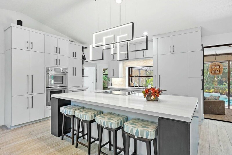 Private deep-water dock w/quick river/ocean access, minimal HOA, beautiful remodeled home w/New Roof. Tropical gardens/fruit trees. Martin County Schools. Serene retreat. Open floorplan. Indoor-outdoor living. Abundance of windows & sliding doors. Screened lanai w/outdoor kitchen, heated pool & hot tub for entertaining. Gourmet kitchen w/custom cabinets & pull-out shelves & Smart Thermador appliances is open to great room with multiple seating/dining areas. Primary offers walk-in closet & bath that lead to quiet side patio & garden. In addition to attached 2-car garage with partial kitchen, there's a separate 2 car garage w/240 v elec that could be woodworking or mechanical shop, guest house, hobby center or ? Convenient to turnpike, schools, shopping, golf courses & private airport.