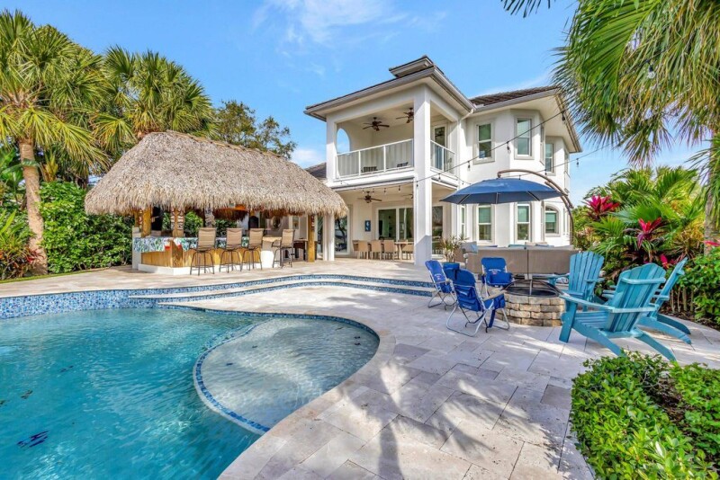 Welcome to your dream home! This rare intracoastal point property boasts unparalleled luxury and stunning waterfront views. Built in 2018, this 4-bedroom, 4-bathroom pool home offers the ultimate in waterfront living. With over 300 ft of water frontage and over 700 ft line of site across the intracoastal, this home features a deep water dock with no fixed bridges in a no wake zone, one private boat lift on a 60 ft. dock, and two jet ski lifts. Over 2,000 sq. ft of outdoor deck and walkways, you'll enjoy endless entertaining with your tiki and full outdoor kitchen. Inside, two primary bedrooms (one upstairs & one downstairs) offer privacy and comfort. The upstairs primary bedroom includes a separate living area and a big outdoor balcony where you can enjoy spectacular sunset views..