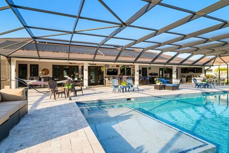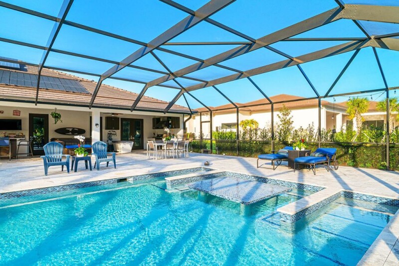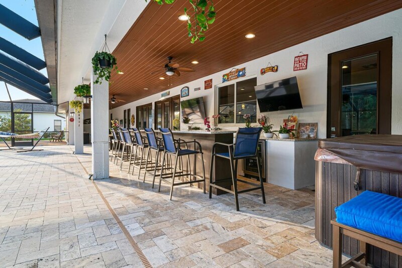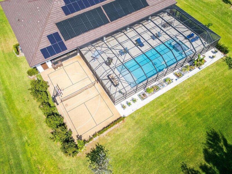 4 Yr New Custom blt by owner home, very spacious open floor plan w/private in law suite, oversized covered screen in lanai & 18 x 50 solar heated salt inground pool with travertine floor surround & in lanai & oversized driveway, lanai entry from Kitchen, Family Room, Master Bedroom & 2 other bedrooms, Only home in subdivision that has private pickelball & basketball court, summer kitchen, home has solar panels, porcelain tile floors throughout, all Quartz counters throughout, covered front open porch w/access to Foyer, 2 Bedrooms & Game Room, Kitchen has abundance of counterspace w/ a large center island & large built in quartz table, backs to secluded preserves, 3 car attached garage plus a golf cart garage.
