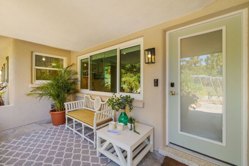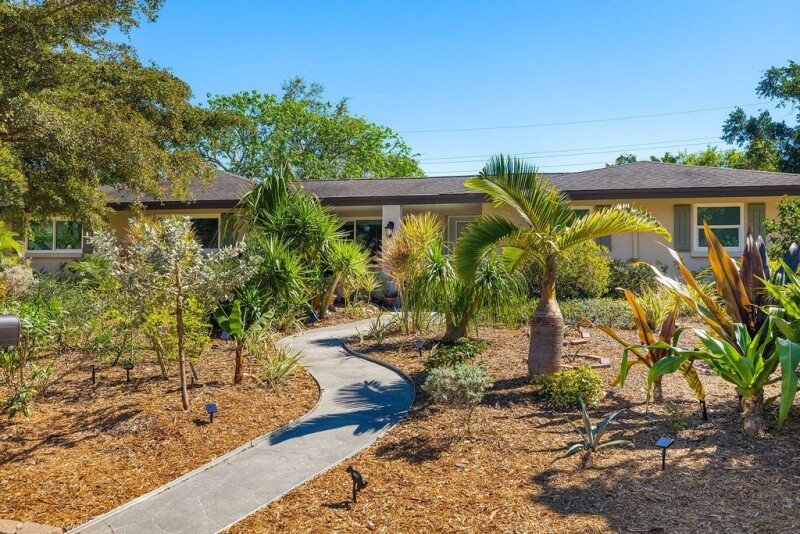 Feast your eyes and soul on a botanical oasis on a spacious corner lot in Sarasota's sought-after East of Trail neighborhood of Arlington Park. This renovated Florida ranch brims with good vibes and artistic flair. Working with clean lines and great bones, the home's 1,636 square feet were transformed into a bright, functional and efficient living space that plays well with its mid-century roots. All windows, doors and sliding glass doors are new and fitted with Cat-5 impact glass. The air-conditioning system is only six years old, and a new 220-volt Level 2 EV charger was installed in 2025. The home's hub is a light-filled great room, and combination dining room/kitchen, both with glass sliders to the screened lanai. The kitchen underwent a complete overhaul by installing new white shaker cabinets with soft-close doors, upper- and under-cabinet lighting, quartz countertops, tile backsplash and recessed ceiling lights. The original terrazzo floors remain well-preserved in the kitchen, dining room and lanai. Private quarters include the primary bedroom with en-suite bath along with two additional bedrooms that share the second bath. The two-car garage has been converted into an artist's studio featuring a split air-conditioning unit, insulated garage door and removable wall. This flex space can be used for creative pursuits, hobbies, family room or climate-controlled storage or it can easily be converted back into a garage. The canopy-covered outdoor living experience is sublime. The fully fenced backyard features a breezy screened lanai, two outdoor patios and extensive gardens illuminated by night lighting. Lush tropical landscaping surrounds the property, including cactus, succulents, fruit trees, herbs and vegetables. Additional features include combination locks on all exterior doors, an enclosed outdoor shower and a spacious storage shed. This Sarasota gem is the epitome of Florida living. Detailed feature sheet available. Schedule your private showing today.