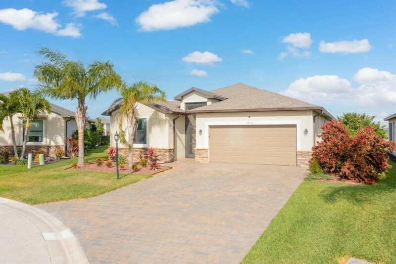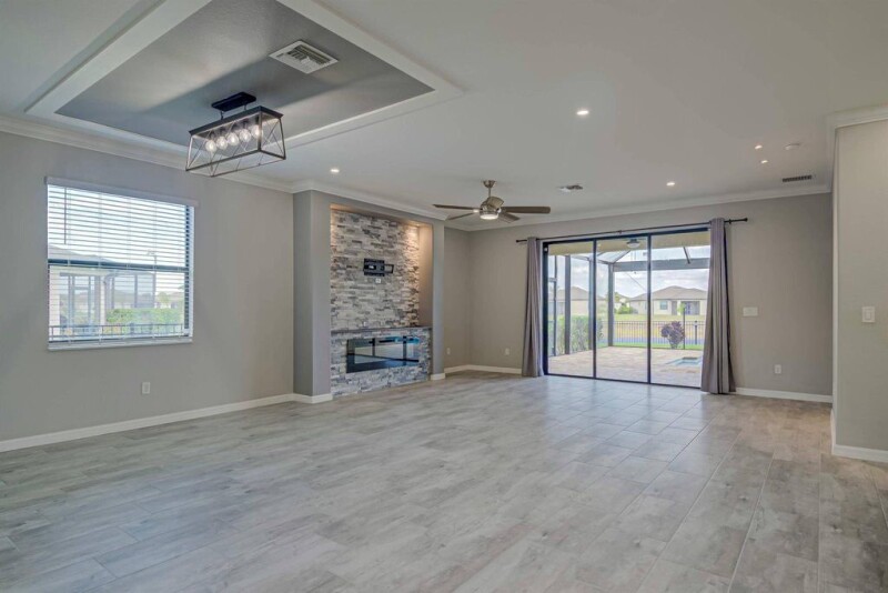Experience the ultimate in luxury living with breathtaking sunrises and serene moonlit nights in this beautiful lakefront pool home located in the gated Portico community. This Trevi model 4-BR, 3-BA gem is nestled on a fenced, cul-de-sac lot, offering both tranquility and privacy. Step inside to find tiled floors thru-out with an island kitchen that is a chef's dream, perfect for entertaining with granite countertops, updated cabinetry, and SS appliances. The built in media center with electric fireplace adds a cozy touch to the open living area, making it the perfect space to unwind. Enjoy outdoor living at its finest with a screened-in, heated pool, ideal for relaxing or hosting gatherings while overlooking the lake. Home is complemented by a spacious layout and.