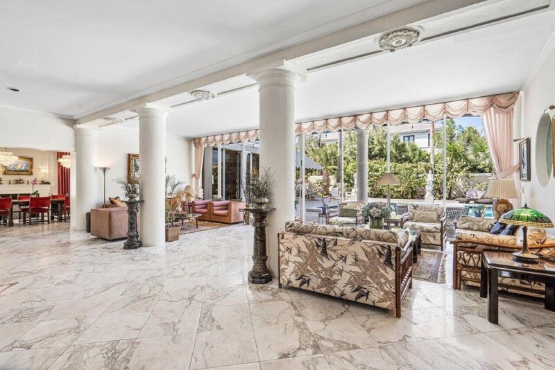 Beautiful John Volk Regency home with ocean views and beach access. Just three streets North of Mar-a-Lago in the Estate Section, this five bedroom, six full and two half bathroom home is ideal for entertaining. A 40 x 20 foot pool and two upstairs balconies with direct ocean views. Just steps away from a private beach access across the road from the house's front door.
