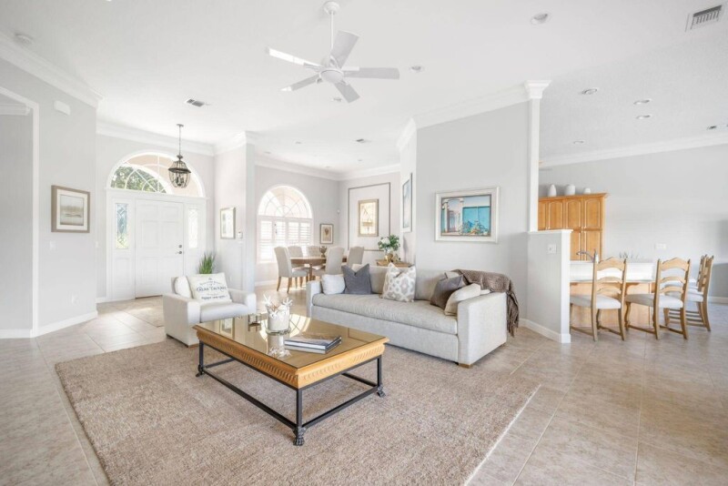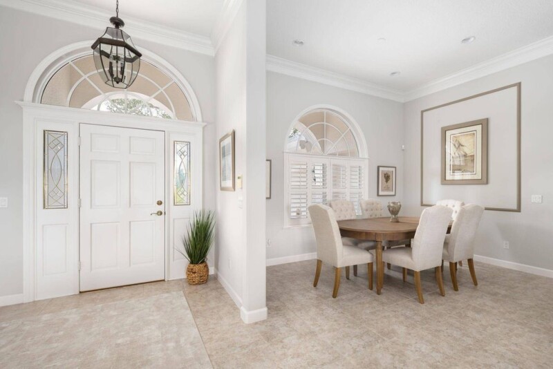 This beautiful home offers stunning panoramic views of the 10th, 15th, and 18th holes of the golf course. The large lanai features a pool and spa, with a covered area.Inside, the elegant living and dining room boasts crown molding, high ceilings, and plantation shutters. The kitchen opens to the family room, making it ideal for both cooking and entertaining. The 4th bedroom serves as a flex space, easily adapted to meet your needs, as an office, guest room, or hobby area.The home also includes a large 3-bay garage with a storage room. A 2021 roof ensures durability and peace of mind.