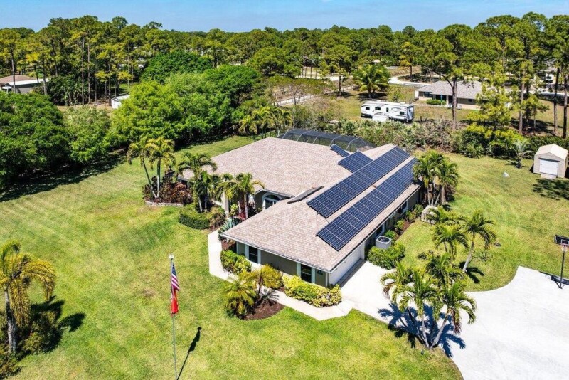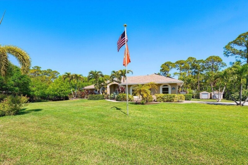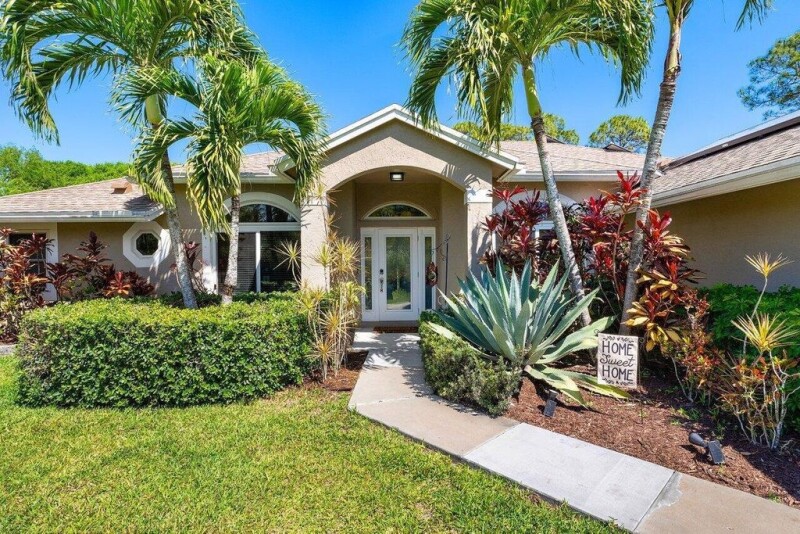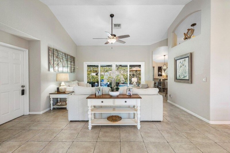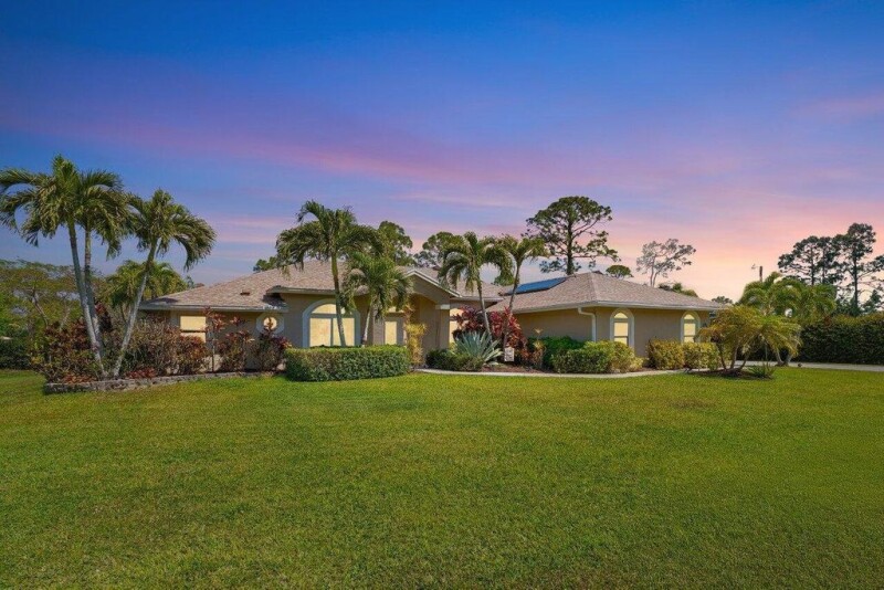 WELCOME HOME This well appointed gem is resting on a premium 1.31 acre lot and boasting 4 bedrooms, 2.5 baths, 2 car garage, saltwater and heated pool, upgrades galore, hurricane impact windows and doors throughout, 2024 roof, whole home reverse osmosis water system, whole home Generac generator with 500-gallon buried propane tank, state of the art solar system, countless smart home features, landscaping galore and this beauty is very well maintained! ENTERING you will discover that this home is on a very private waterfront corner lot, fully fenced with custom electric gate, convenient concrete driveway and a covered entry that brings you inside the custom etched front door where you are greeted by soaring 12' volume ceilings, spacious foyer, abundance of natural lighting and a (CLICK).